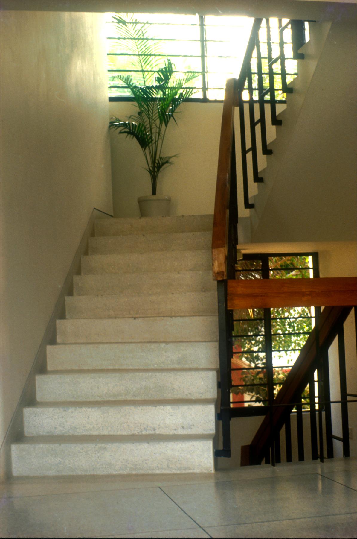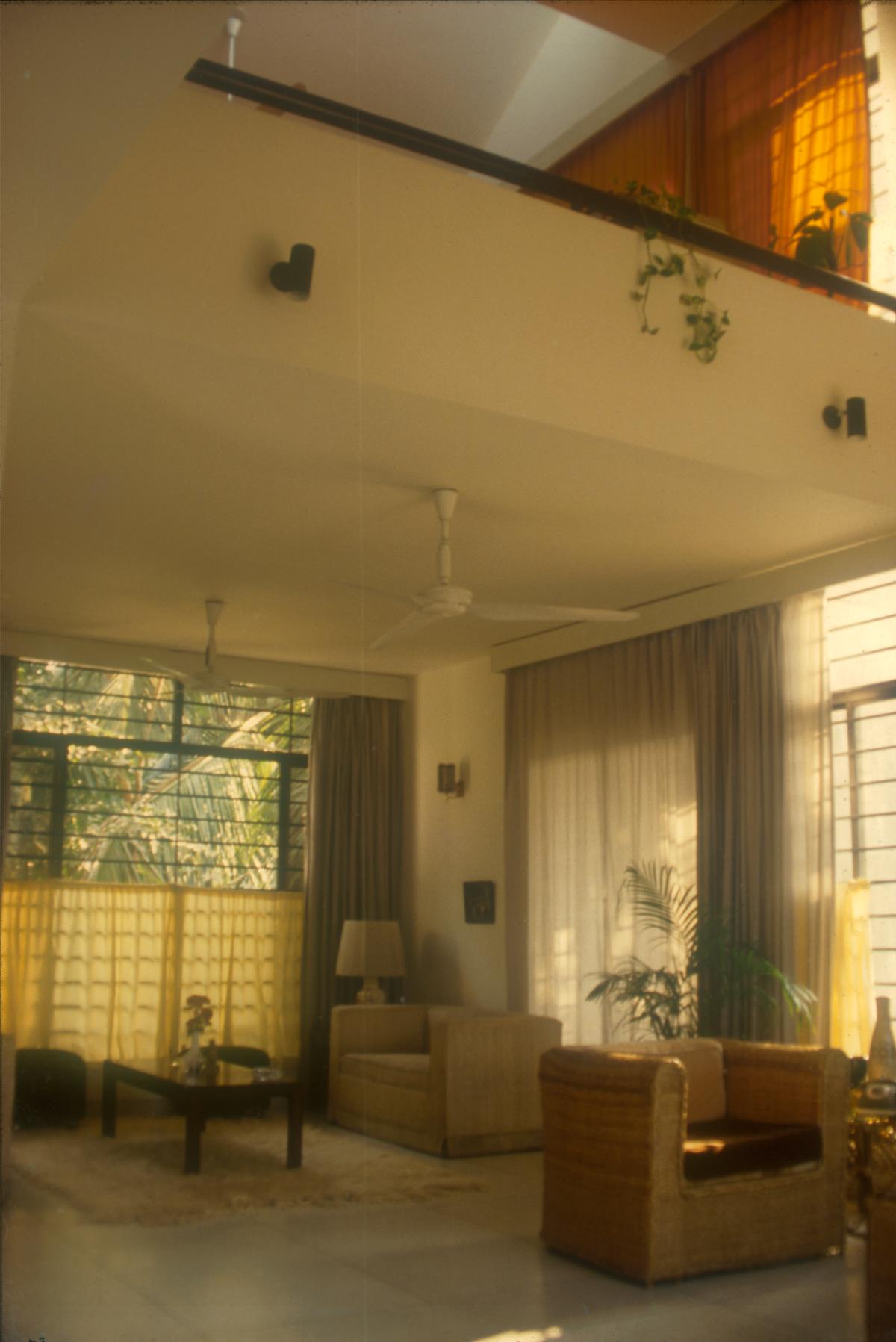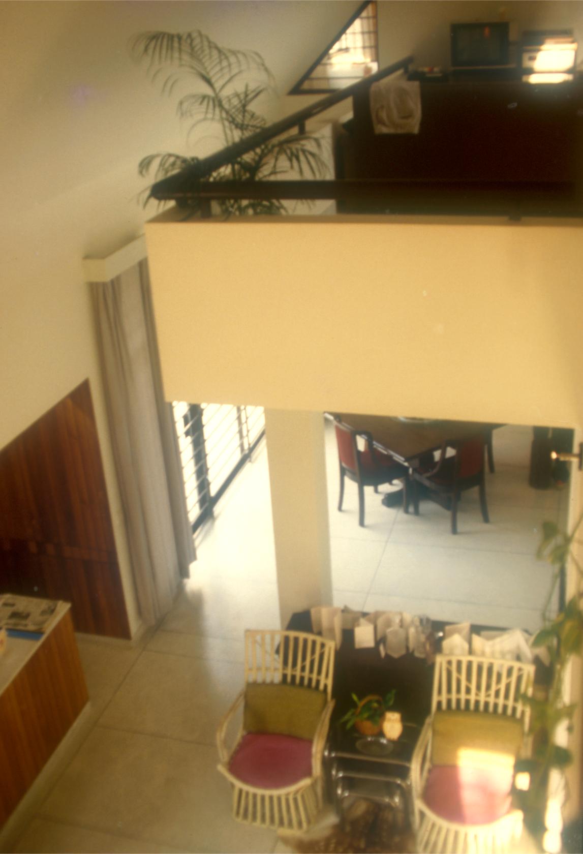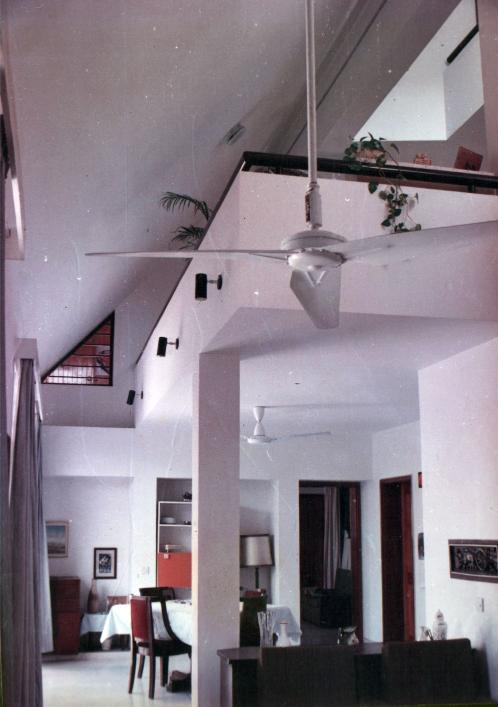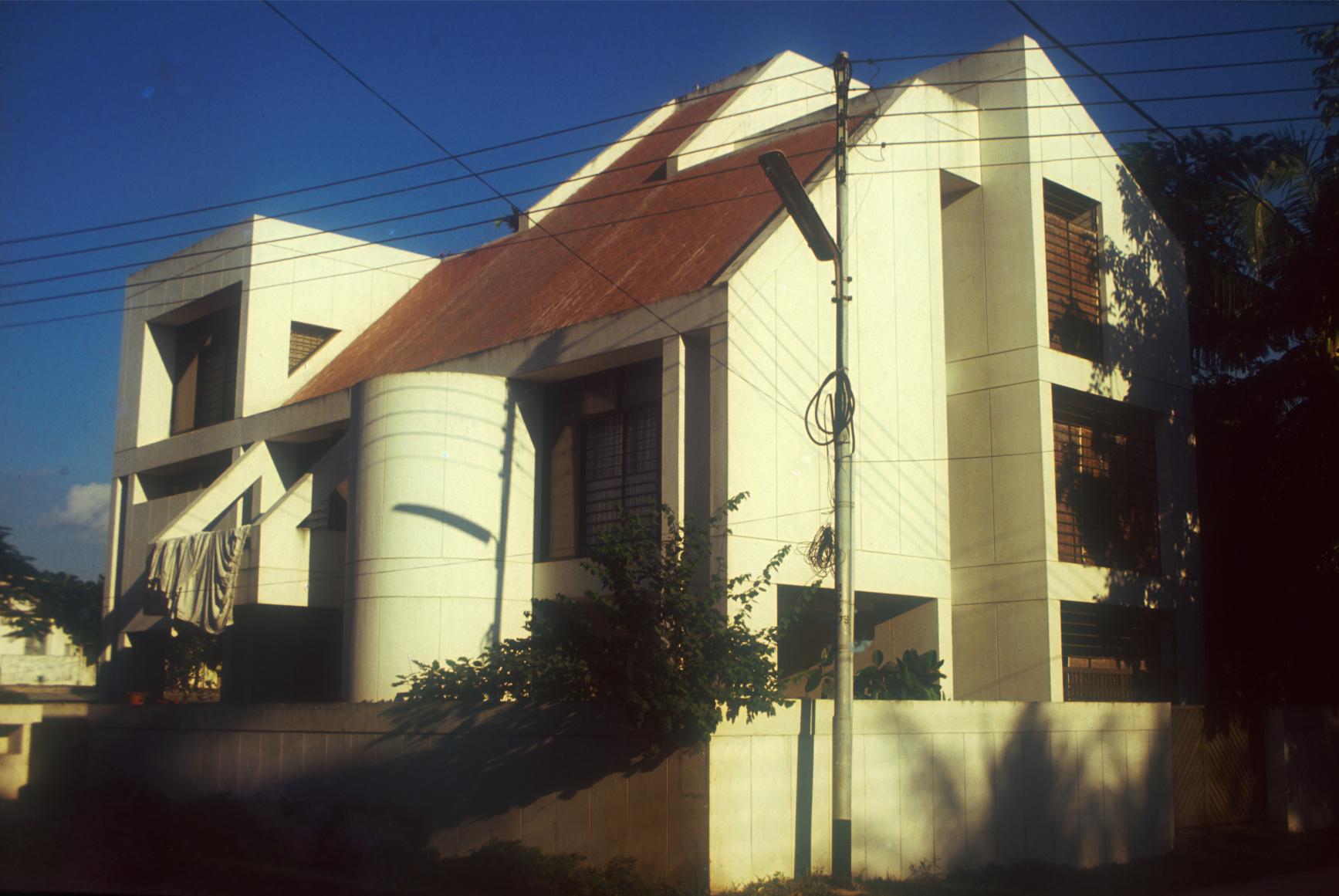 Two triangular volumes (at 45° and 30°) of the building colide face to face to create compaction in the inner volume of spaces. The free-flowing spaces within the small house give an experience of spaciousness. Large glass windows on the south and north provide ample light and air movement. The white walls and the brick tiled-inclined roofs give a sense of domesticity.